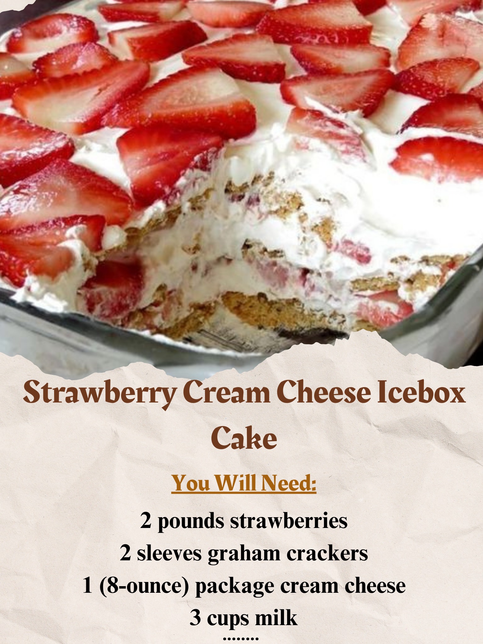 Pour half of this cream cheese mixture over the graham crackers, followed by a layer of strawberry slices. Add another layer of graham crackers and cover with the remaining cream cheese mixture. Finish with a final layer of strawberries and refrigerate for 6 to 8 hours.