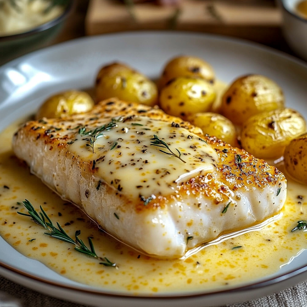 Aiglefin rôti au beurre et crème de safran avec pommes de terre confites