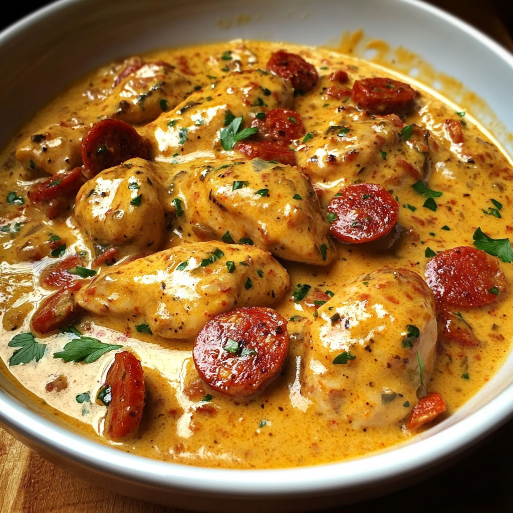 Ce plat associe la tendreté du poulet à la richesse d’une sauce crémeuse, relevée par le chorizo qui apporte une touche piquante. Ce mélange de saveurs est parfait pour un repas réconfortant qui plaira à toute la famille. Facile à préparer, il est aussi idéal pour les jours où vous avez envie d’un repas à la fois simple et raffiné.