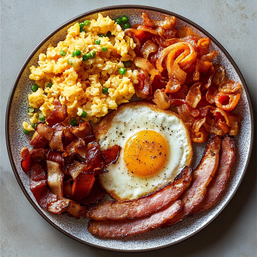 - Disposez les ingrédients : Sur une assiette, placez les tranches de bacon croustillantes, la saucisse grillée et les hash browns dorés.
