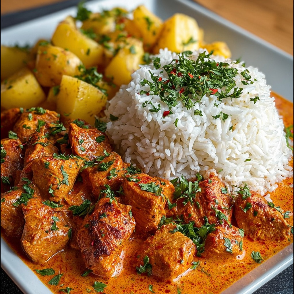 L’assiette de poulet au beurre facile avec riz parfumé et pommes de terre dorées est un plat complet, équilibré et délicieux, qui séduit par sa combinaison de textures et de saveurs. Facile à préparer, adaptable et réconfortant, il convient à toutes les occasions, du dîner quotidien au repas plus festif. Chaque bouchée offre le contraste du poulet fondant, du riz parfumé et des pommes de terre croustillantes, créant un repas harmonieux