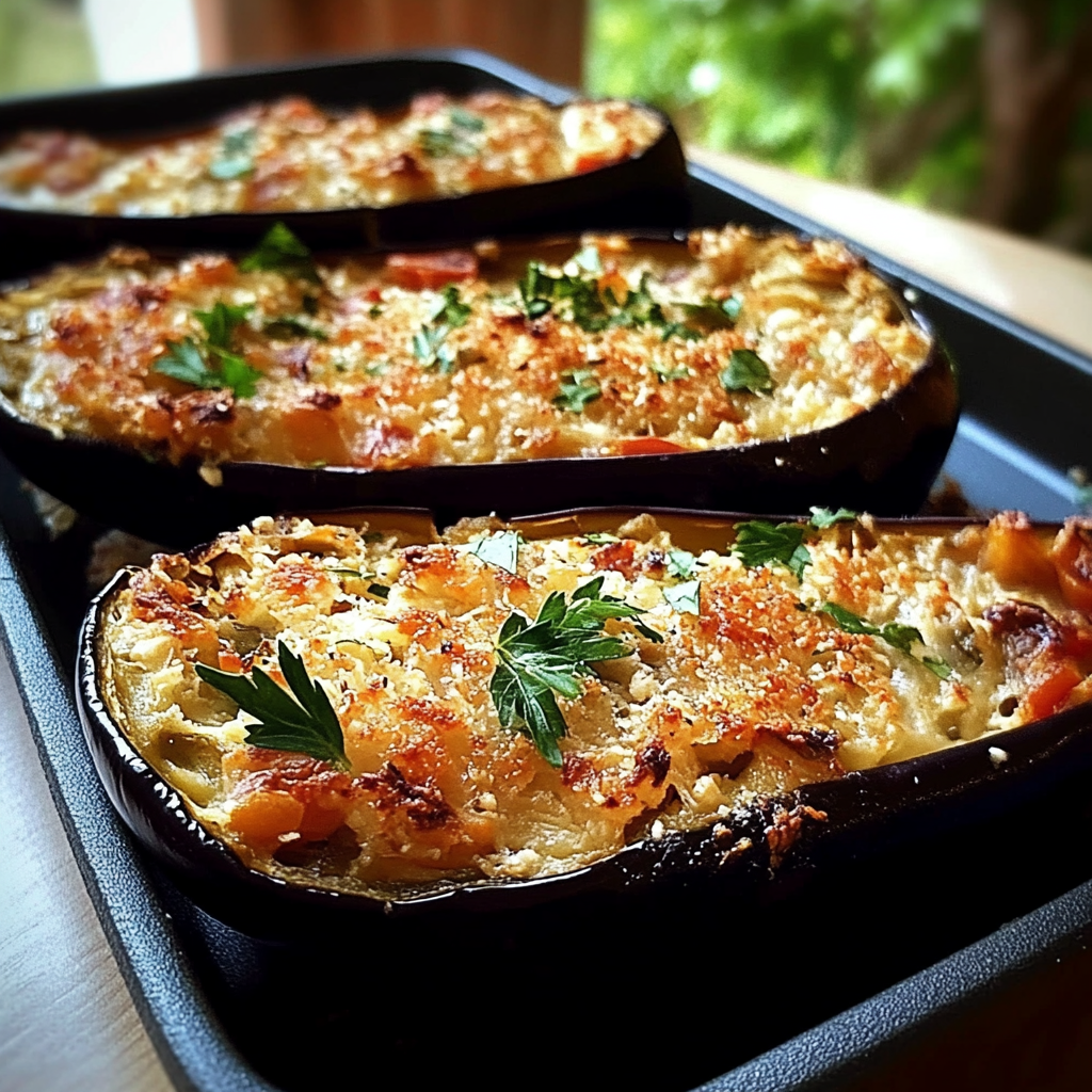- Disposez les aubergines farcies sur une plaque de cuisson et enfournez à 180 °C (350 °F) pendant environ 20 minutes, ou jusqu’à ce que le fromage soit doré et bouillonnant.
