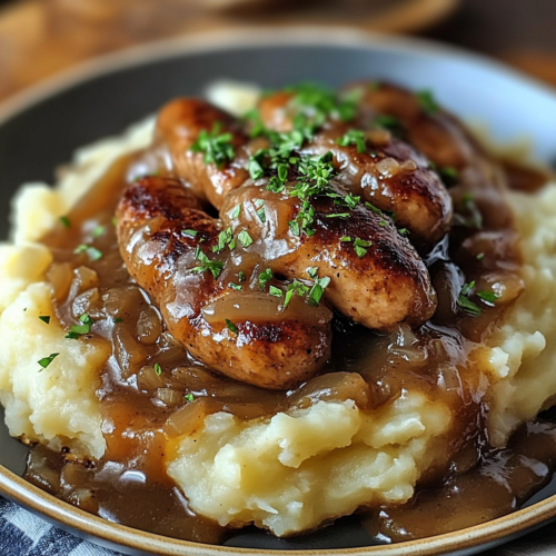 Bangers and Mash avec Sauce à la Bière et Oignons