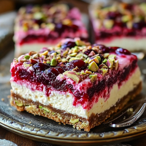Les barres de cheesecake cerise et pistache sont un dessert à la fois élégant et décadent, idéal pour toutes les occasions. L’association de la douceur des cerises et du croquant des pistaches crée une texture et un goût incomparables. Ces barres de cheesecake sont crémeuses, légèrement sucrées, et parfaites pour satisfaire toutes vos envies sucrées. Vous pouvez les servir lors d’une fête, d’un dîner entre amis ou simplement en tant que petit plaisir pour vous-même.