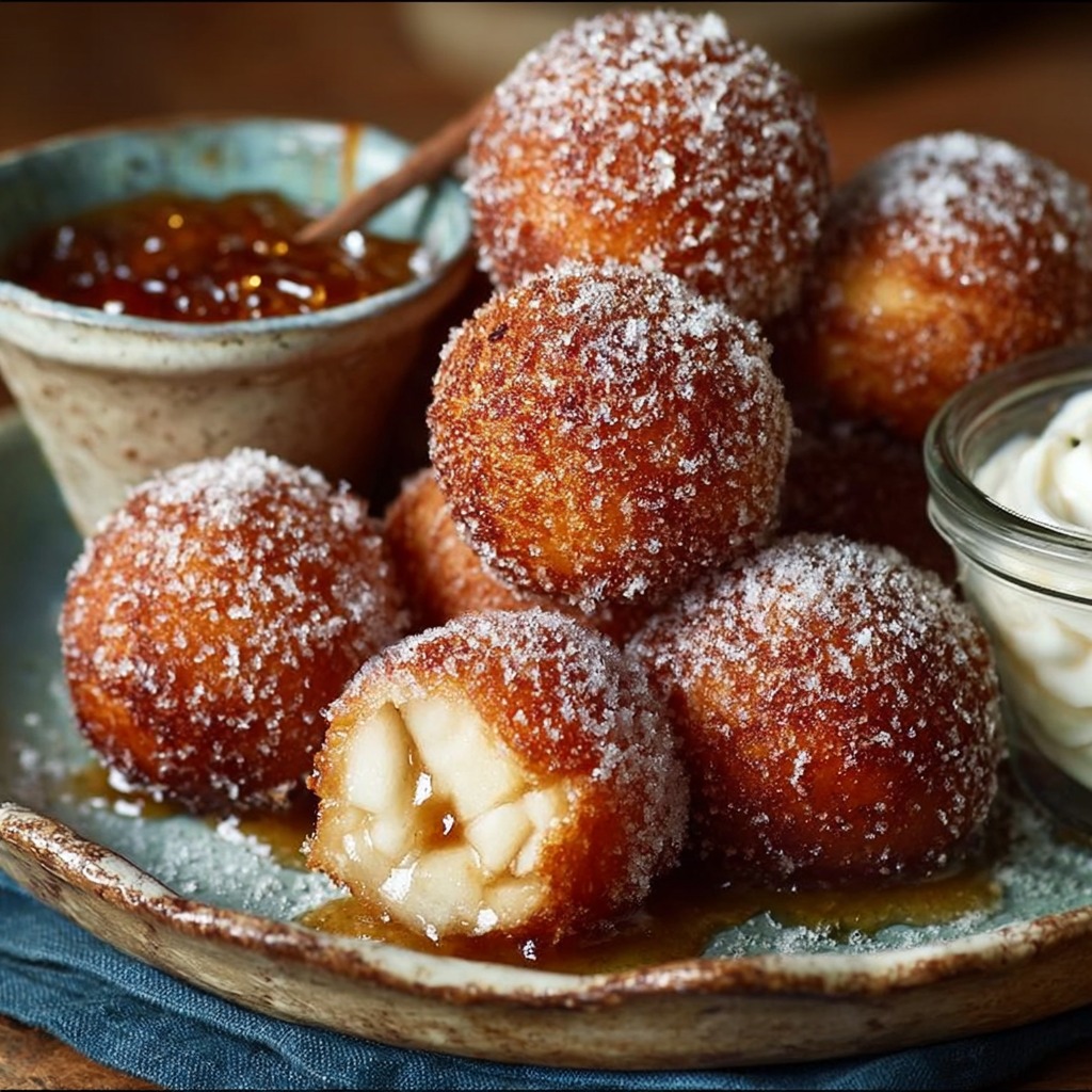 Visuellement, les beignets aux pommes façon grand-mère sont une véritable invitation à la gourmandise. Leur surface dorée, légèrement irrégulière, brille sous la fine couche de sucre glace. À l’intérieur, la pomme tendre dégage un parfum sucré et fruité, qui s’harmonise parfaitement avec la pâte. Chaque beignet est unique, comme s’il portait la marque de la main qui l’a façonné.