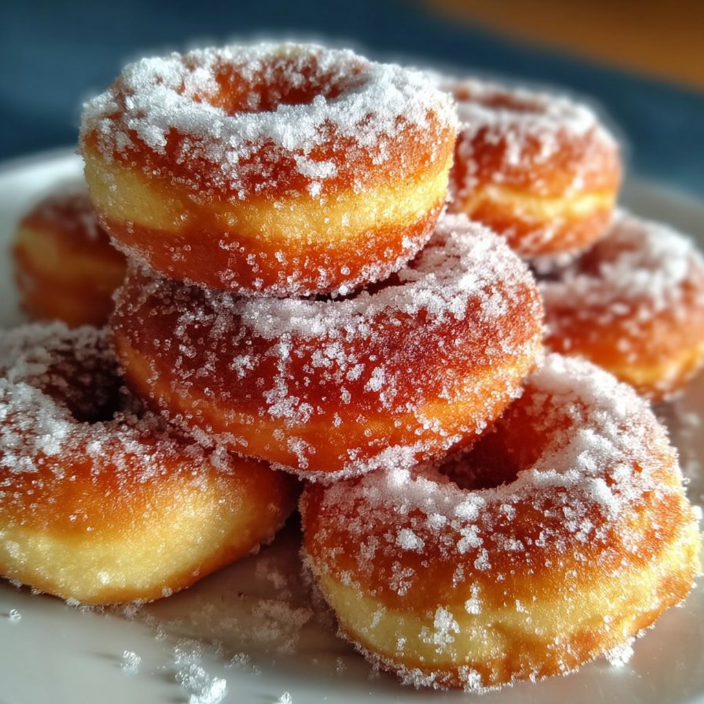 Lorsque les beignets sont encore tièdes, ils sont généreusement saupoudrés de sucre glace. Le sucre adhère légèrement grâce à la chaleur et apporte une touche sucrée et brillante.