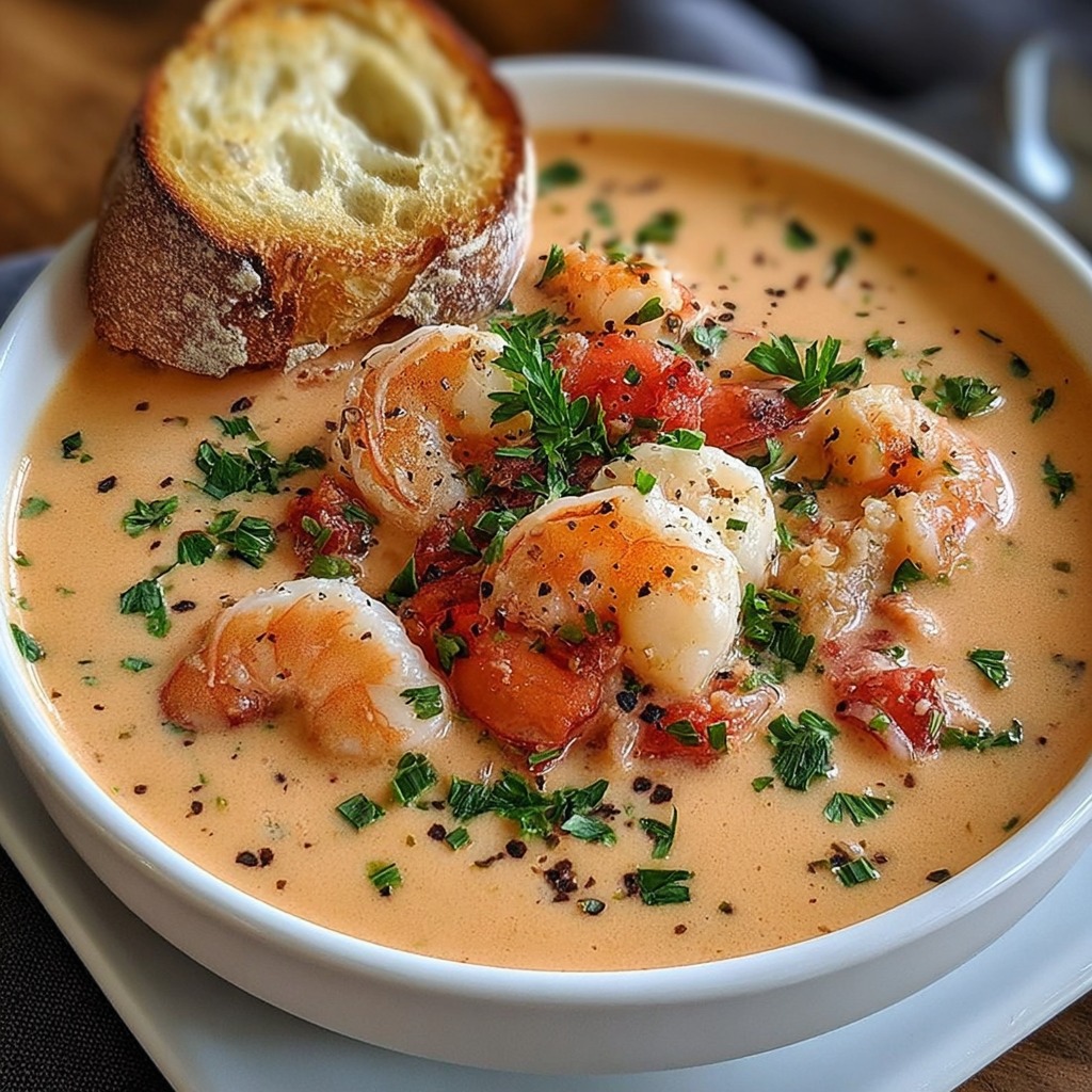 Bisque crémeuse aux fruits de mer, crabe et crevettes