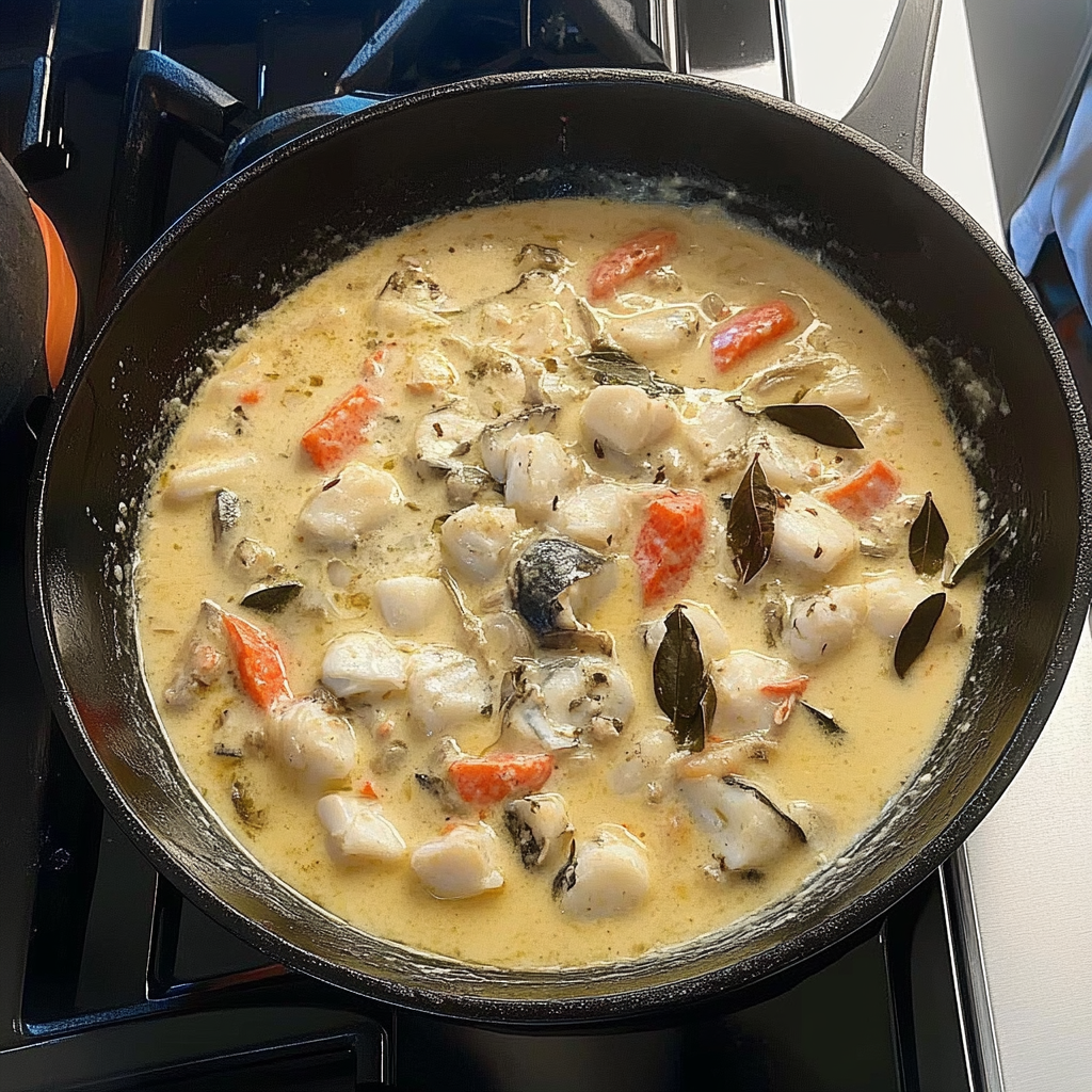 Ragoût crémeux de poisson et crevettes, alliant douceur marine et épices, parfait pour un repas léger.