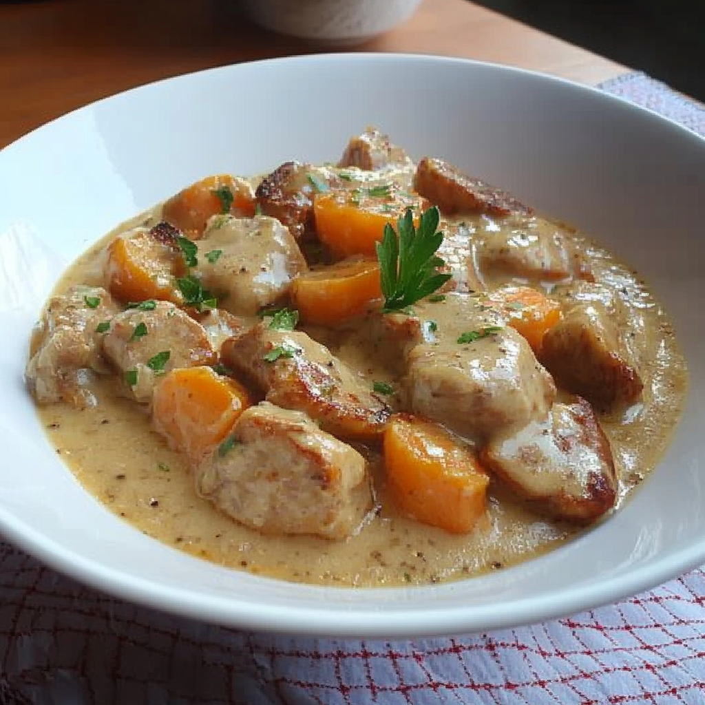 Ragoût de porc mijoté lentement avec une sauce à la moutarde ancienne riche et savoureuse.