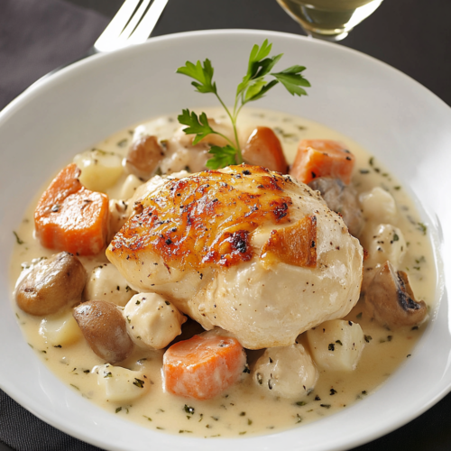 La blanquette de poulet crémeuse sans vin est prête à être servie. Disposez généreusement la viande et les légumes dans des assiettes creuses. Nappez le tout de la sauce crémeuse bien chaude. Ce plat peut être accompagné de riz basmati, de pommes de terre vapeur ou même de pâtes fraîches pour compléter le repas. Vous pouvez également garnir le plat de persil frais ou d’une touche de crème pour une présentation plus raffinée.
