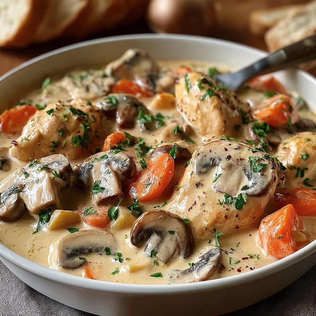 Pour un poulet tendre et juteux, maintenez une cuisson douce et évitez de faire bouillir la sauce après l’ajout de la crème et du jaune d’œuf. Utilisez des champignons frais pour plus de saveur et de texture.
