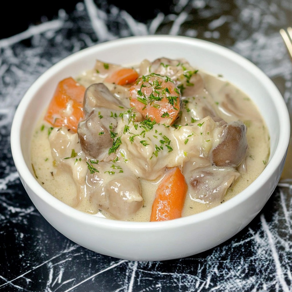Contrairement à ce que son nom pourrait laisser penser, la blanquette n’est pas une viande blanche, mais un plat cuit « à blanc », c’est-à-dire sans saisie initiale de la viande. Celle-ci est pochée doucement, ce qui préserve sa tendreté et sa couleur pâle. La sauce, à base de roux blond, de bouillon et de crème, est nappante, douce et riche sans être lourde.