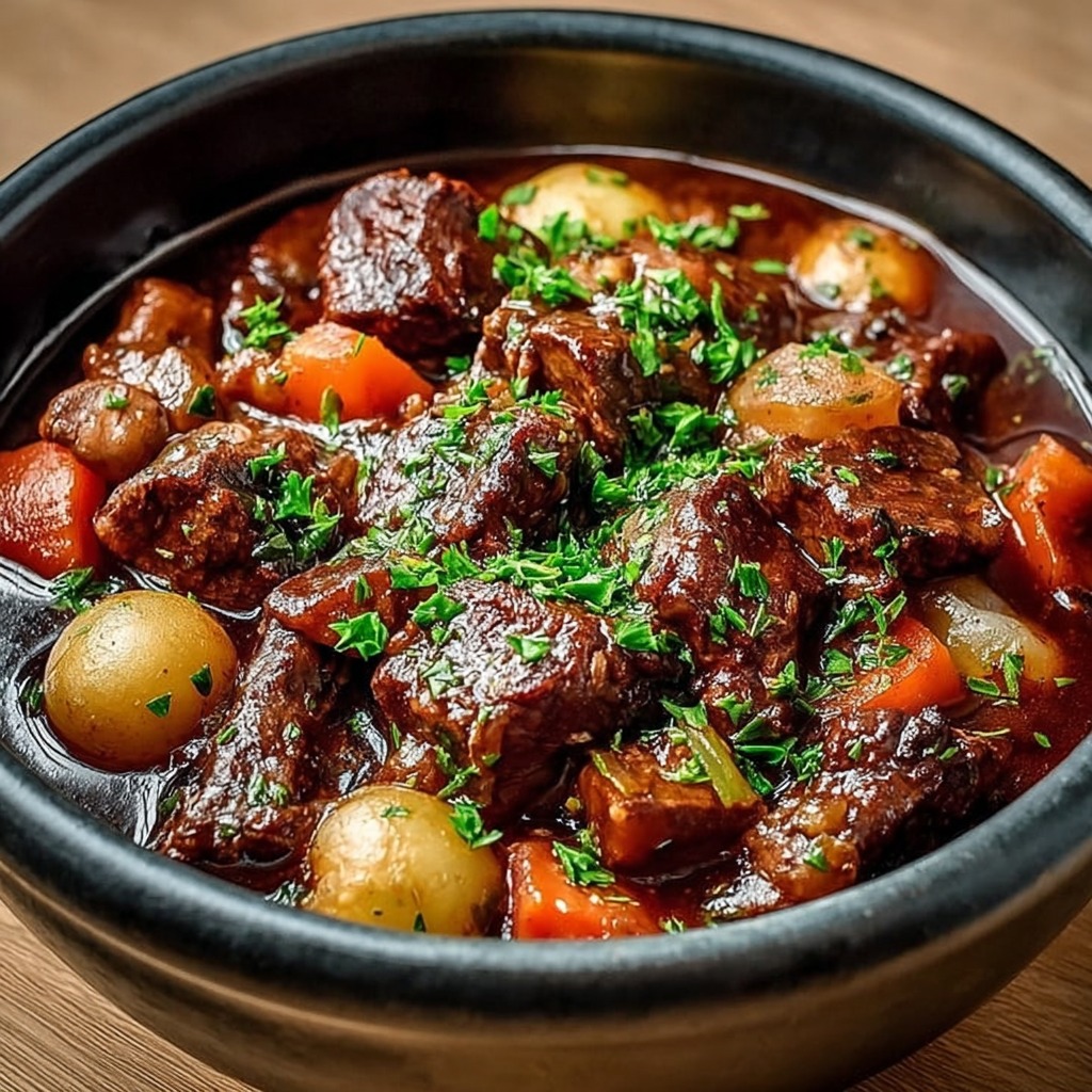 Le vin rouge de Bourgogne est l’ingrédient clé pour la profondeur et le caractère du plat. Il est utilisé pour déglacer la viande et cuire lentement le ragoût, permettant aux saveurs de se concentrer. Le thym, le laurier et le bouillon de bœuf complètent le profil aromatique, créant une sauce riche et parfumée. La cuisson longue favorise l’harmonisation des saveurs entre la viande, le vin et les légumes.