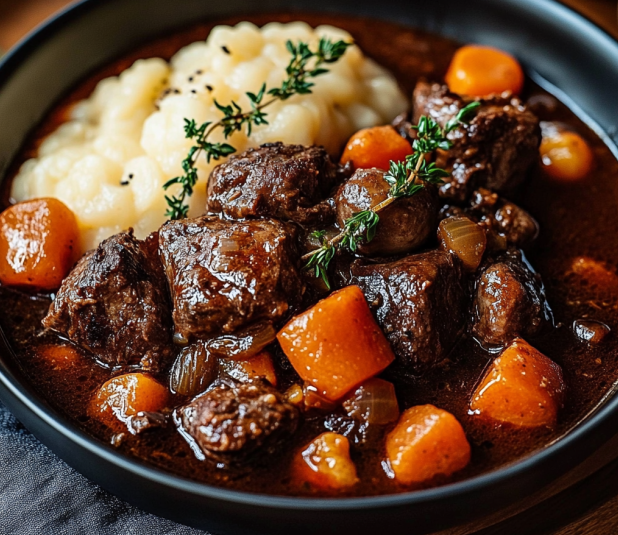 Voici à quoi ressemble un bœuf bourguignon traditionnel, riche en couleurs et en saveurs :