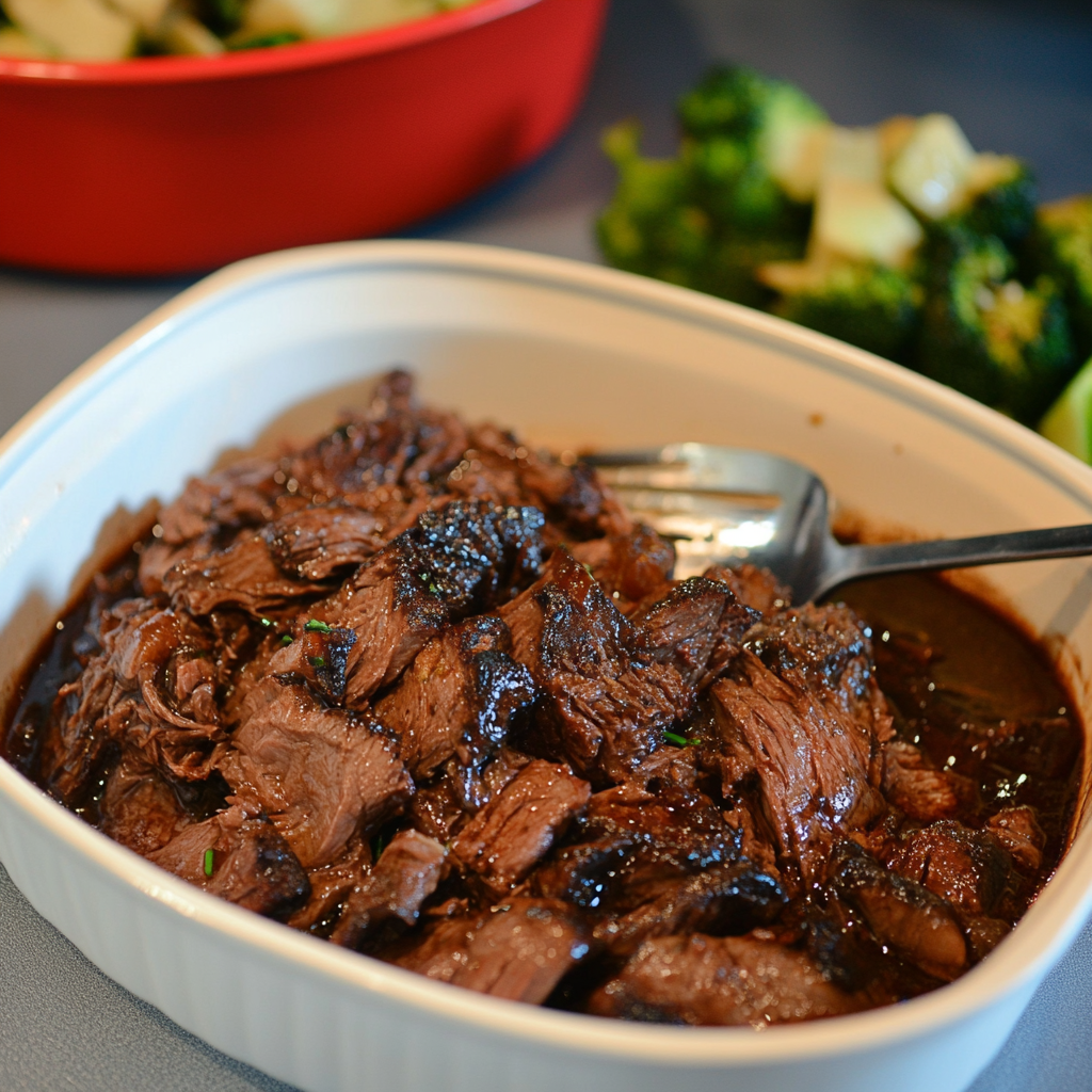 Bœuf braisé tendre mijoté dans un jus balsamique riche, idéal pour un repas réconfortant délicieux.