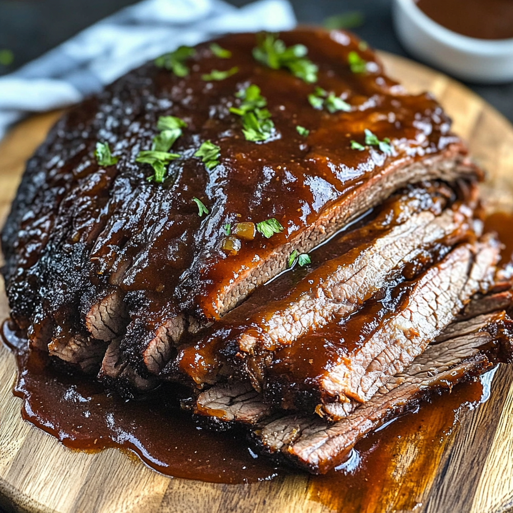 Un tendre brisket de bœuf cuit lentement dans une sauce BBQ maison riche et savoureuse, parfait pour un repas réconfortant.