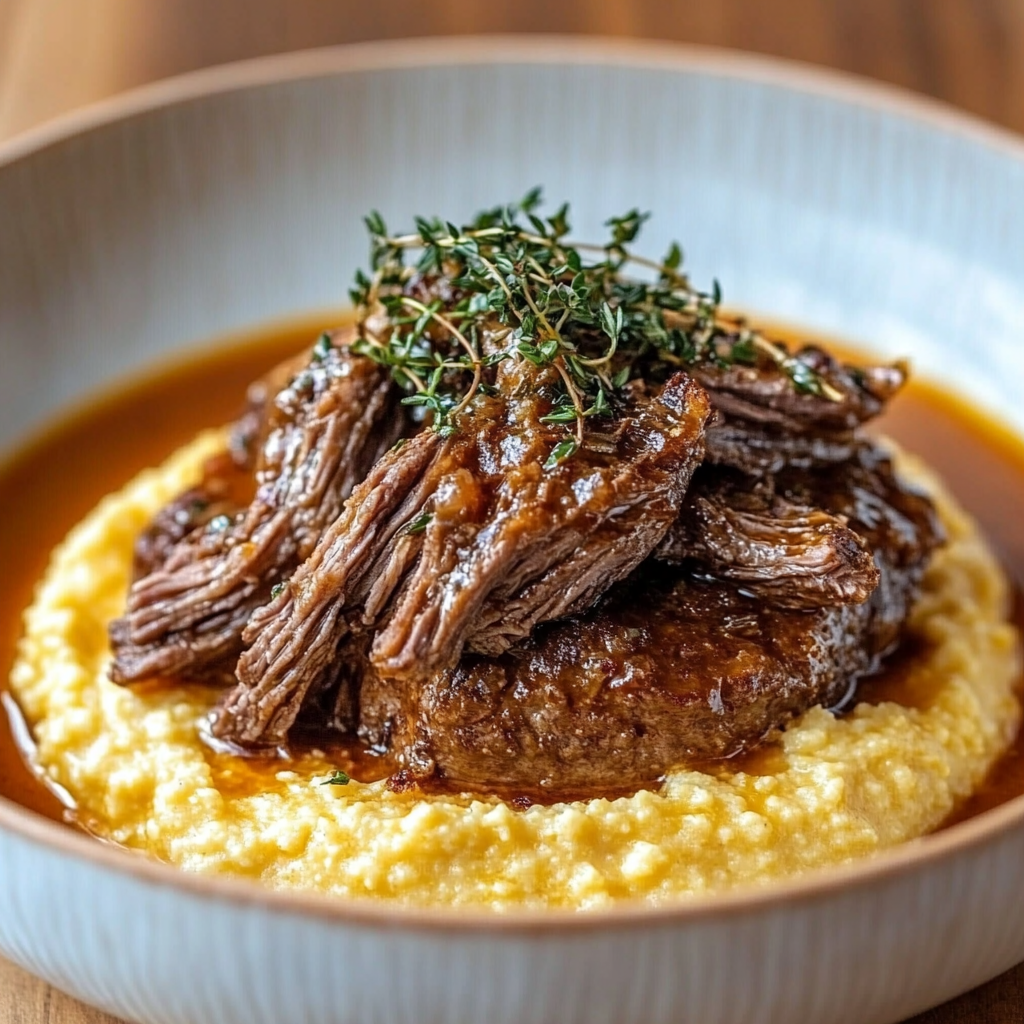 Ce bœuf effiloché sur polenta crémeuse est bien plus qu’un plat rustique : c’est un concentré de confort, de douceur, de caractère et de générosité. Cuit lentement, relevé avec de simples herbes et accompagné d’une polenta au parmesan, ce plat ravira aussi bien les palais raffinés que les appétits affamés.
