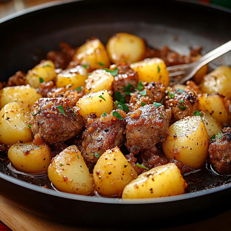 Remettez les pommes de terre dans la poêle avec la viande.