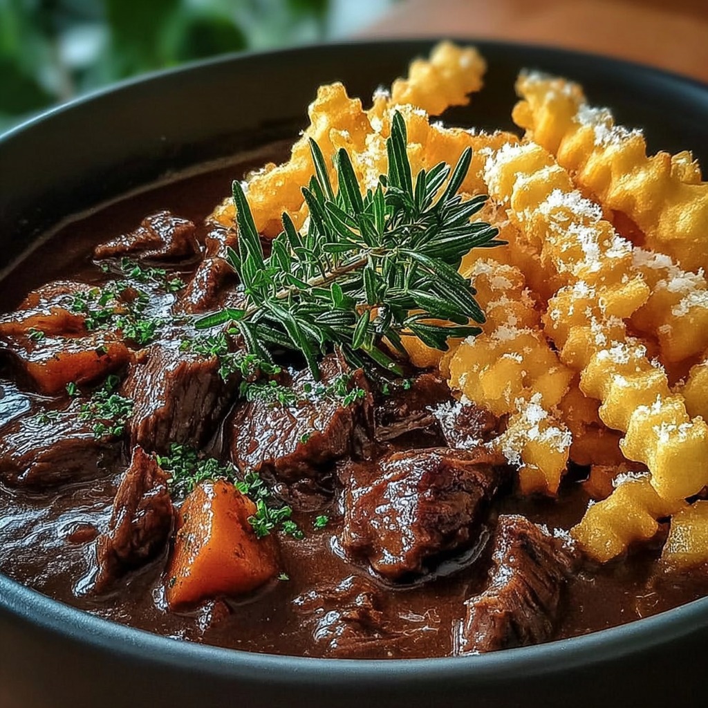 Le bœuf mijoté se déguste chaud, accompagné des frites encore croustillantes. Chaque bouchée combine tendreté de la viande et croquant des pommes de terre, avec la richesse aromatique du jus de cuisson. Servir immédiatement pour profiter de la texture optimale des frites et de la viande.