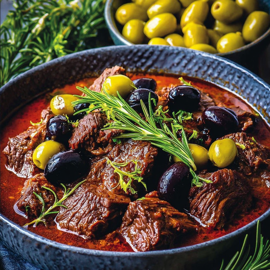 Il existe des plats qui ont le pouvoir de suspendre le temps. Dès que l’on soulève le couvercle de la cocotte, une vapeur parfumée envahit la cuisine, et l’on sait déjà que le repas sera inoubliable. Le bœuf mijoté aux olives et romarin est l’un de ces plats emblématiques de la cuisine familiale. Il évoque les dimanches lents, les grandes tablées, les conversations qui s’étirent, et cette odeur profonde de viande confite qui se mêle aux herbes.