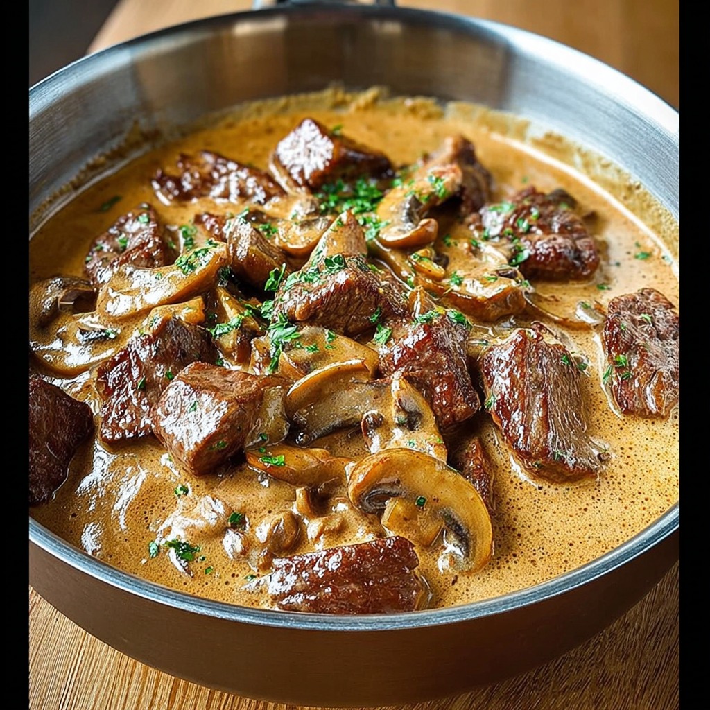 Le bœuf Stroganoff est laissé à reposer quelques instants hors du feu. Ce temps permet aux saveurs de se lier harmonieusement. Le persil frais, finement ciselé, est ajouté juste avant le service pour apporter une note herbacée et une touche de fraîcheur.