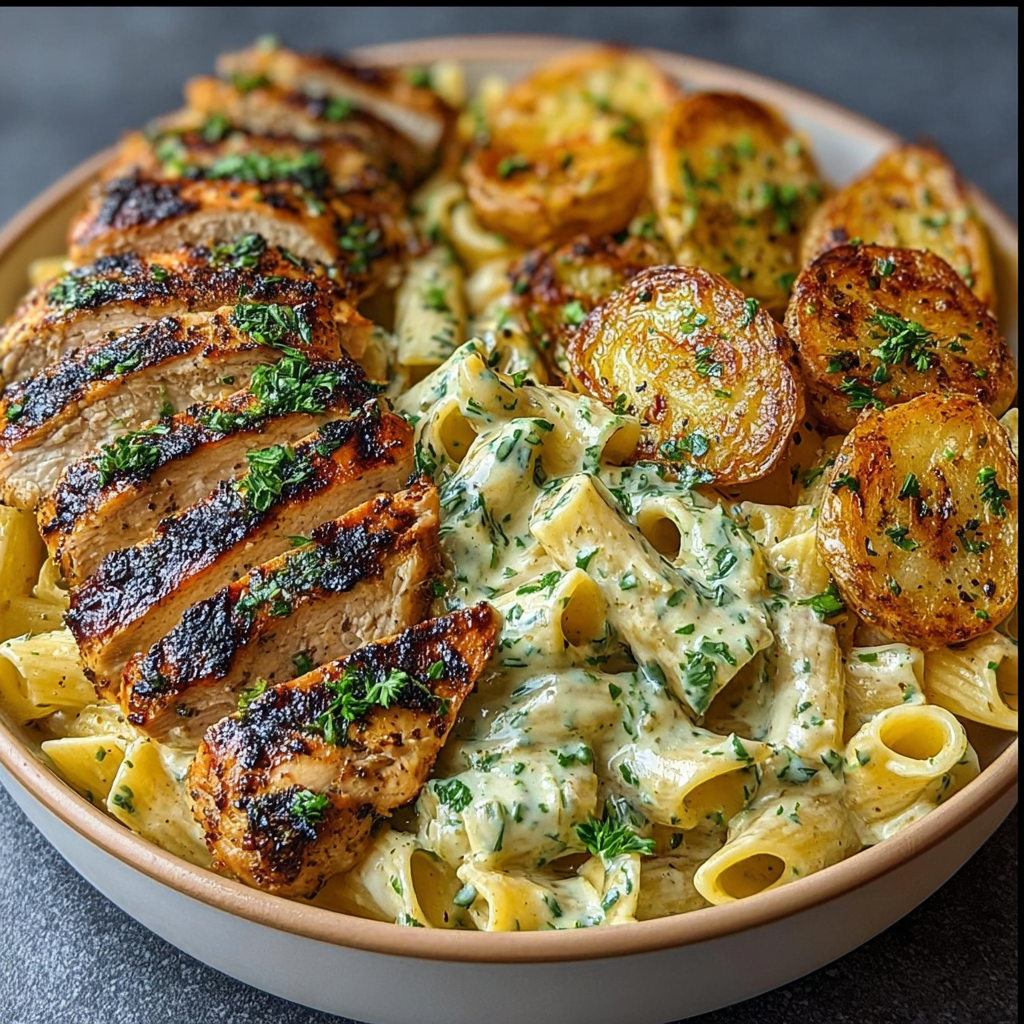 Le bol de poulet grillé aux herbes avec pâtes crémeuses à l’ail et pommes de terre croustillantes est bien plus qu’une simple recette. C’est un plat moderne, inspiré des “bowls” populaires dans les restaurants et cafés du monde entier, mais revisité ici dans une version généreuse, familiale et profondément réconfortante.
