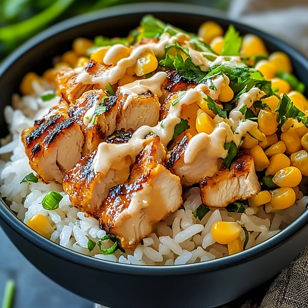 Un bol savoureux combinant poulet grillé, maïs de rue crémeux et riz parfumé à la lime.