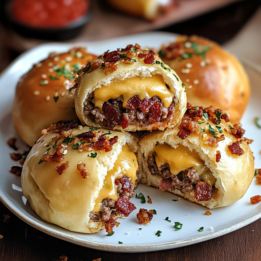 Savourez ces délicieuses bombes de cheeseburger au bacon, parfaites pour les soirées entre amis ! Ces petites merveilles croustillantes sont remplies de viande savoureuse, de bacon croustillant et de fromage fondant, le tout enveloppé dans une pâte à biscuits dorée. Que ce soit pour un apéritif, un plat principal ou un repas de fin de semaine, ces bombes sont une excellente façon de ravir vos invités.