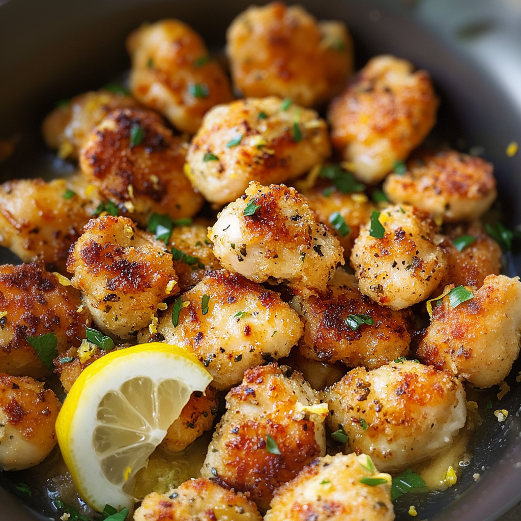 Vos bouchées de poulet à l’ail et au citron sont prêtes ! Servez-les chaudes avec des accompagnements de votre choix.