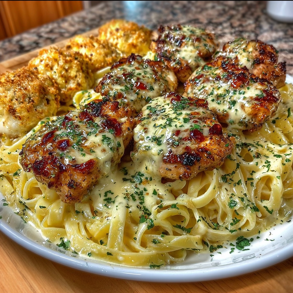 Ce plat combine des bouchées de poulet dorées et savoureuses, enrobées d’un beurre à l’ail parfumé, avec des pâtes crémeuses au parmesan. C’est un repas riche en saveurs, réconfortant et simple à préparer, parfait pour un dîner en famille ou entre amis. L’association du poulet tendre et des pâtes onctueuses fait de ce plat un incontournable pour les amateurs de cuisine gourmande et facile.