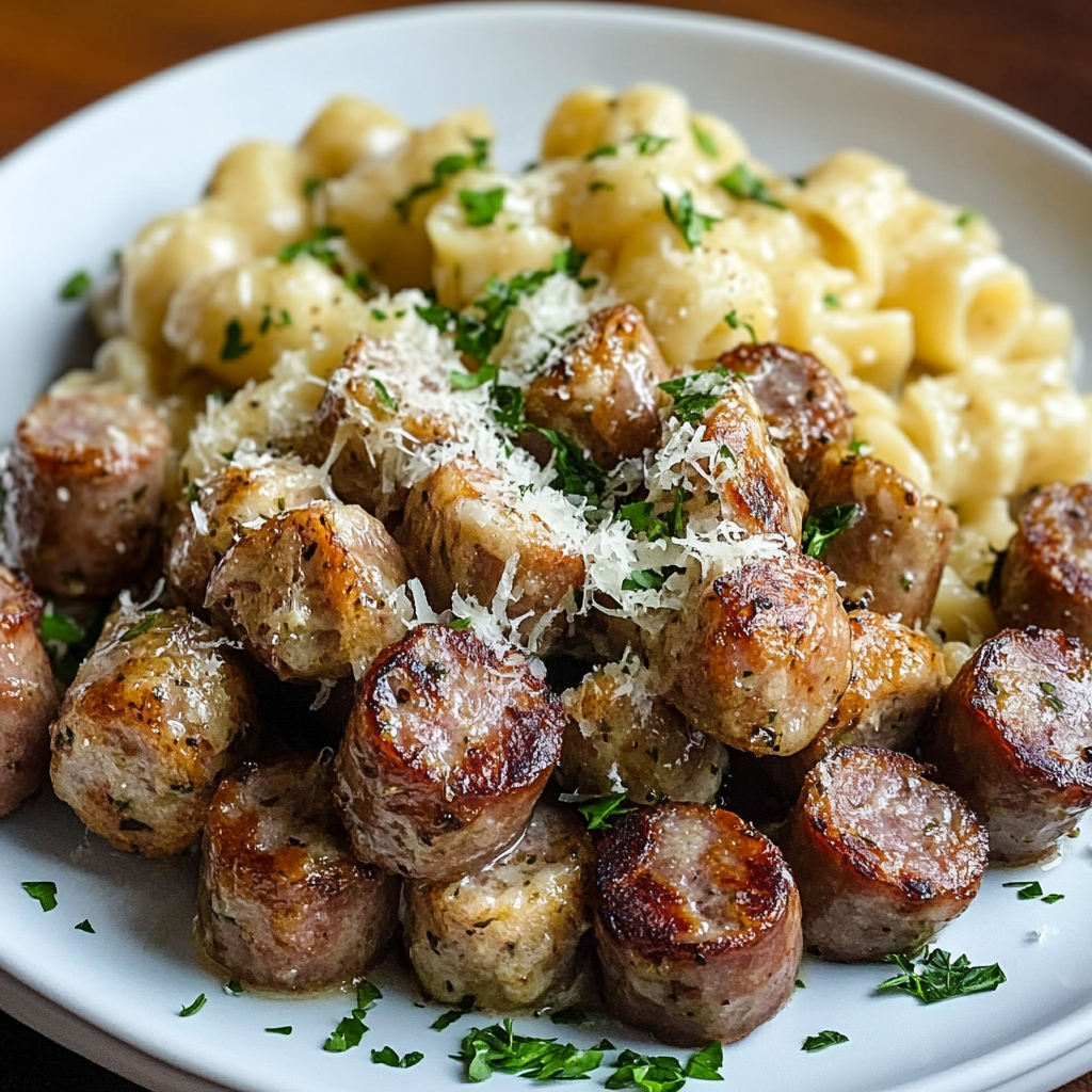 Disposez les bouchées de saucisse sur les pâtes crémeuses au Parmesan. Garnissez de fromage Parmesan supplémentaire et de persil frais pour une touche de fraîcheur.