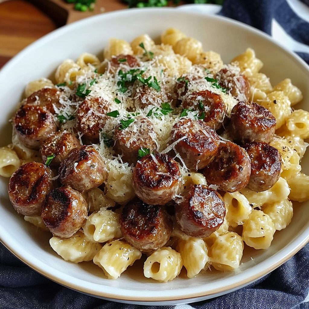 Les Bouchées de Saucisse au Beurre d’Ail avec Pâtes Crémeuses au Parmesan sont un plat réconfortant, facile à préparer, et qui plait à toute la famille. Avec des ingrédients simples et une méthode de cuisson rapide, ce dîner peut être sur votre table en moins de 35 minutes. L’alliance des saucisses savoureuses, du beurre parfumé à l’ail, et de la sauce crémeuse au parmesan est tout simplement irrésistible.
