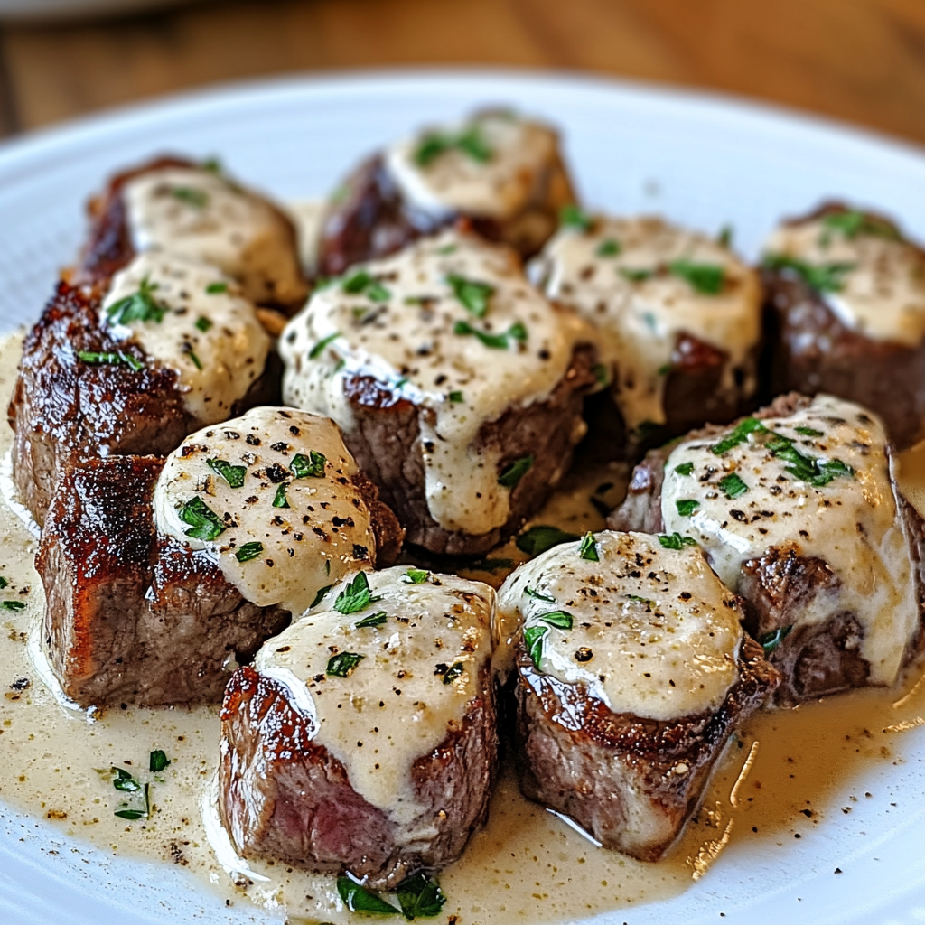 Savourez chaque bouchée de ces délicieuses bouchées de steak cuites à la perfection, enrobées de beurre à l’ail et accompagnées d’une sauce crémeuse au parmesan. Ce plat réconfortant est idéal pour un dîner en famille ou pour impressionner vos invités lors d’une occasion spéciale. Avec une préparation simple et des ingrédients savoureux, ce plat deviendra rapidement un favori !