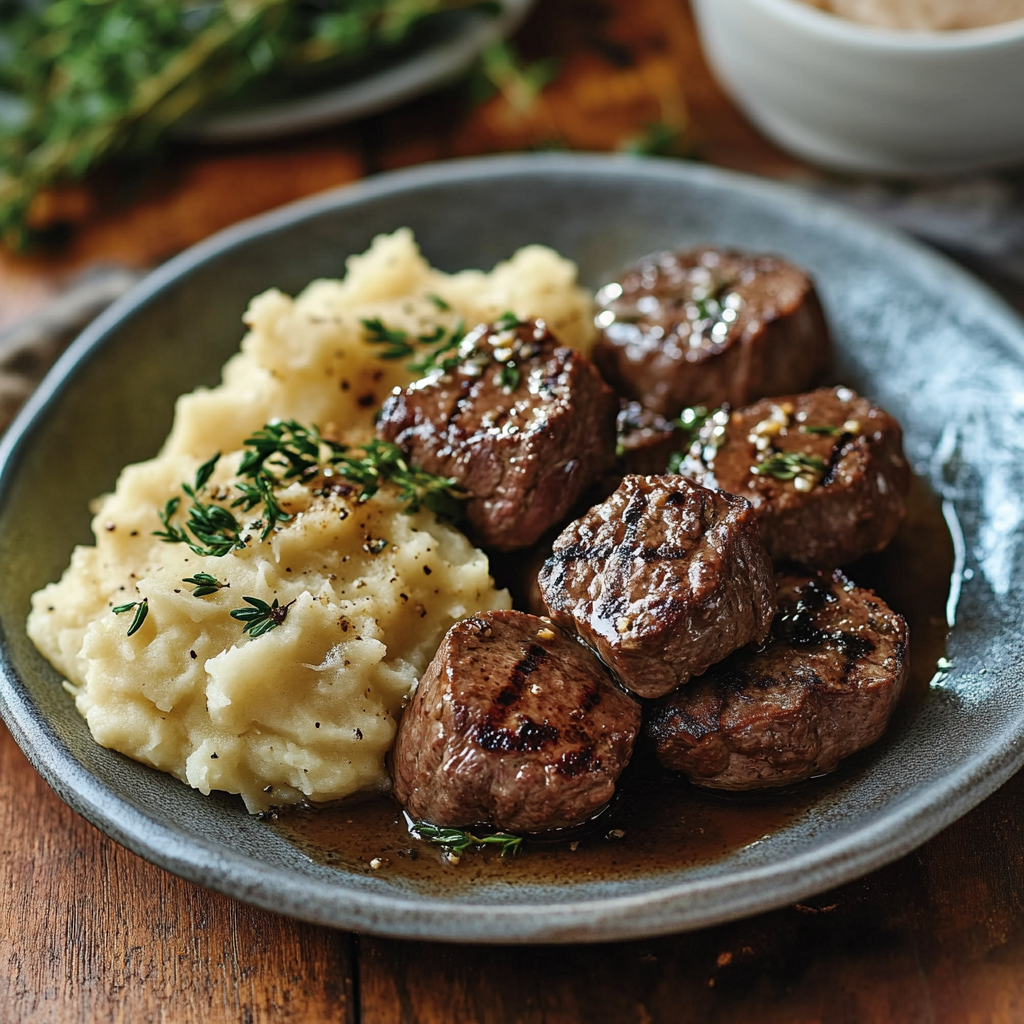 Ces bouchées de steak au beurre à l’ail accompagnées d’une purée de pommes de terre crémeuse constituent un plat réconfortant qui ravira les palais. Parfait pour un dîner en famille ou un repas entre amis, ce plat allie saveurs riches et textures délicieuses. Servez-le avec une garniture de persil frais pour ajouter une note de fraîcheur et un peu de couleur.