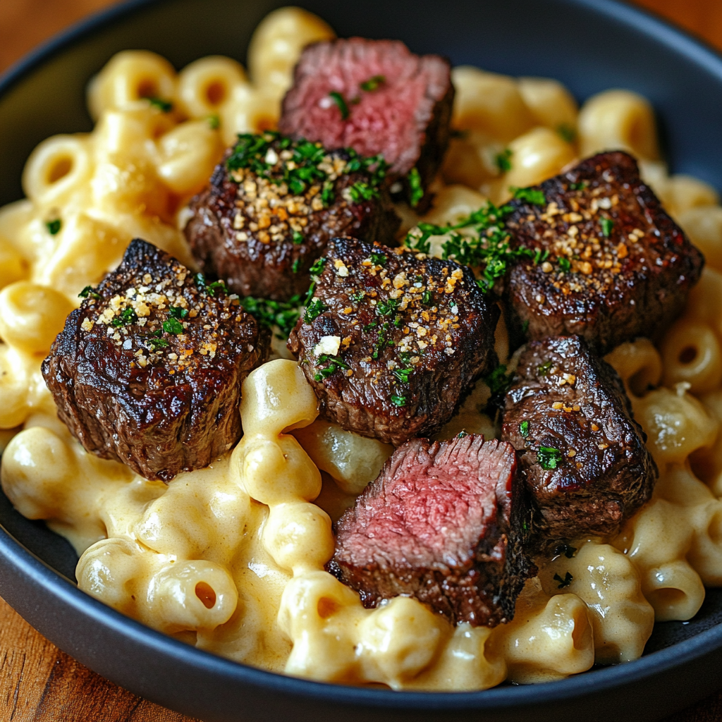 Bouchées de Steak Tendre avec Macaroni au Fromage Crémeux