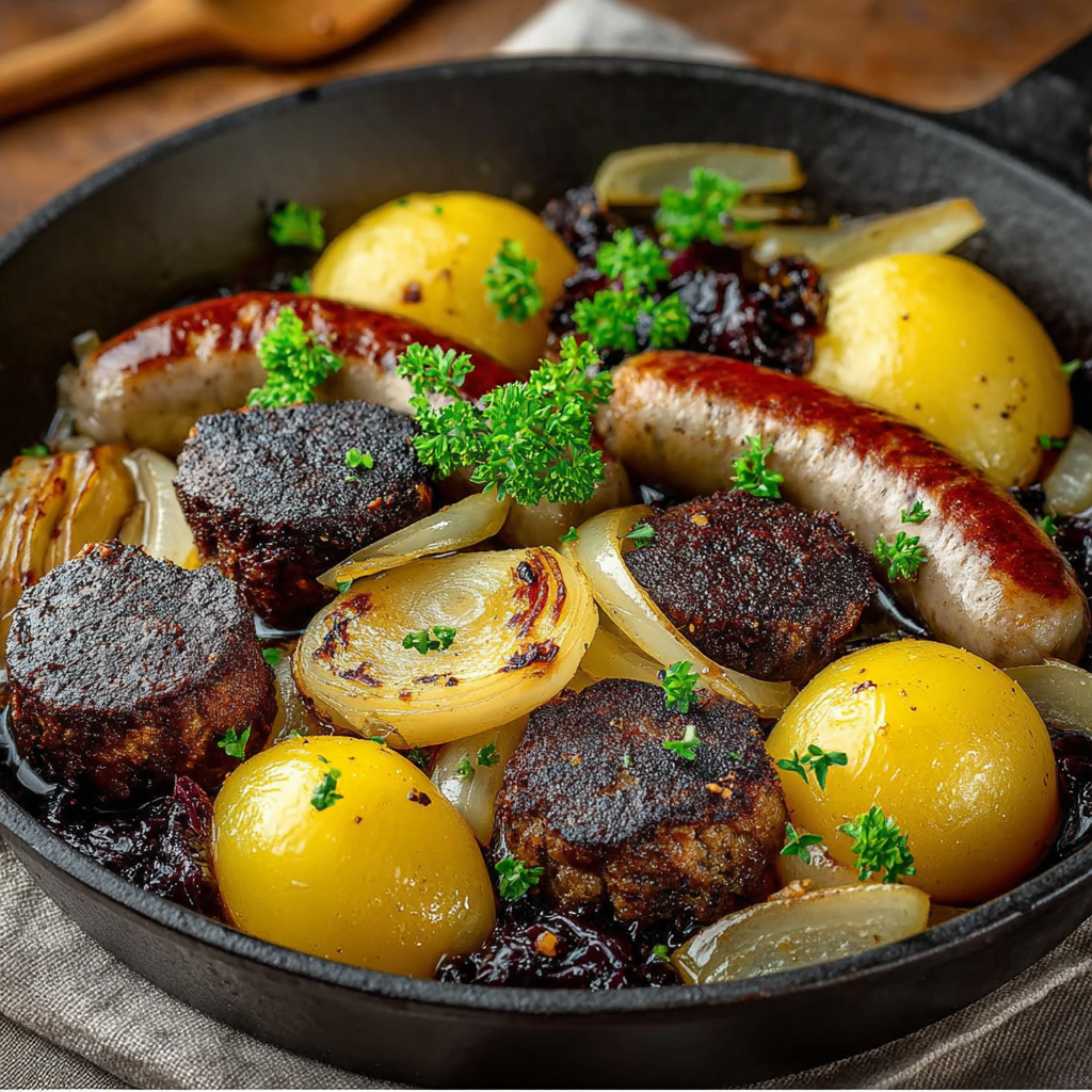 La combinaison du boudin noir avec les pommes est un équilibre parfait entre le salé, le sucré et l’acidité. Les pommes apportent une fraîcheur qui contrebalance la richesse du boudin, tandis que l’oignon caramélisé ajoute profondeur et rondeur au plat.