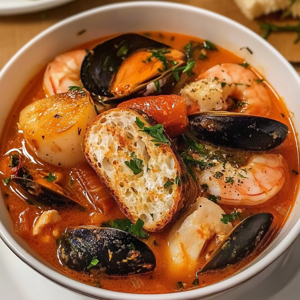 - Pain à l’Ail : Servez avec un pain à l’ail grillé pour un goût encore plus riche et harmonieux avec le bouillon de poisson.