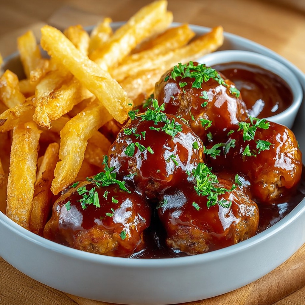Augmenter la température de l’huile à 180°C et replonger les frites pour une seconde cuisson de trois à quatre minutes jusqu’à ce qu’elles soient dorées et croustillantes. Égoutter et saler immédiatement. Les frites maison sont croustillantes à l’extérieur et moelleuses à l’intérieur, offrant un contraste parfait avec les boulets tendres et fondants.