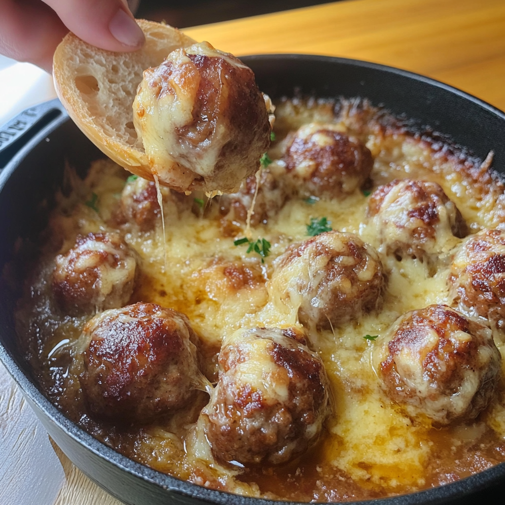 Les French Onion Meatballs sont l’alliance parfaite entre deux classiques : les boulettes de viande et la soupe à l’oignon gratinée. Fondantes, savoureuses, enveloppées d’une sauce riche et surmontées de fromage doré, elles offrent un moment de pur réconfort. À tester absolument !
