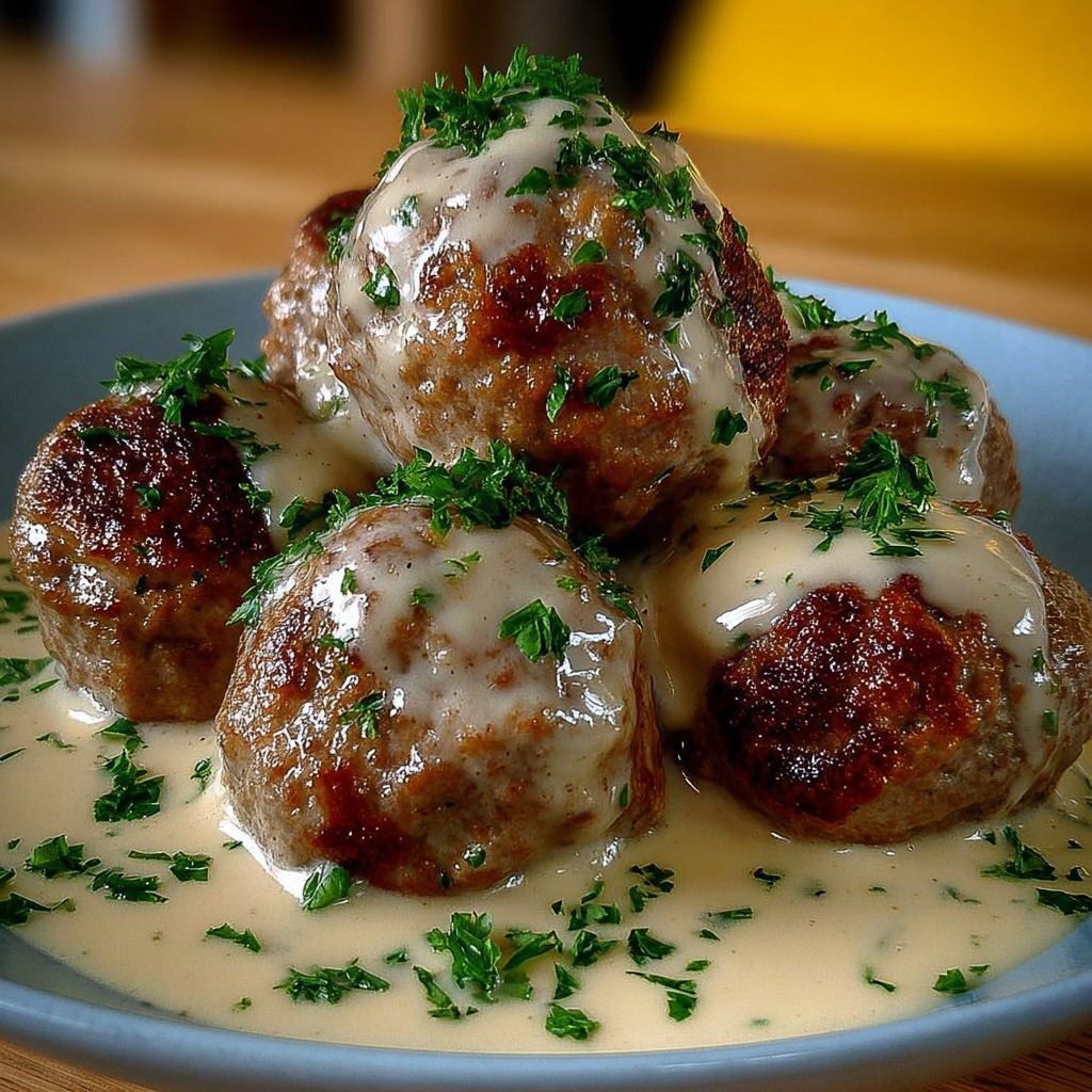 Les boulettes de bœuf à la sauce blanche crémée se servent chaudes, accompagnées idéalement de pâtes fraîches, de riz, de pommes de terre vapeur ou d’une purée maison. Un légume vert en accompagnement apporte fraîcheur et équilibre au repas.