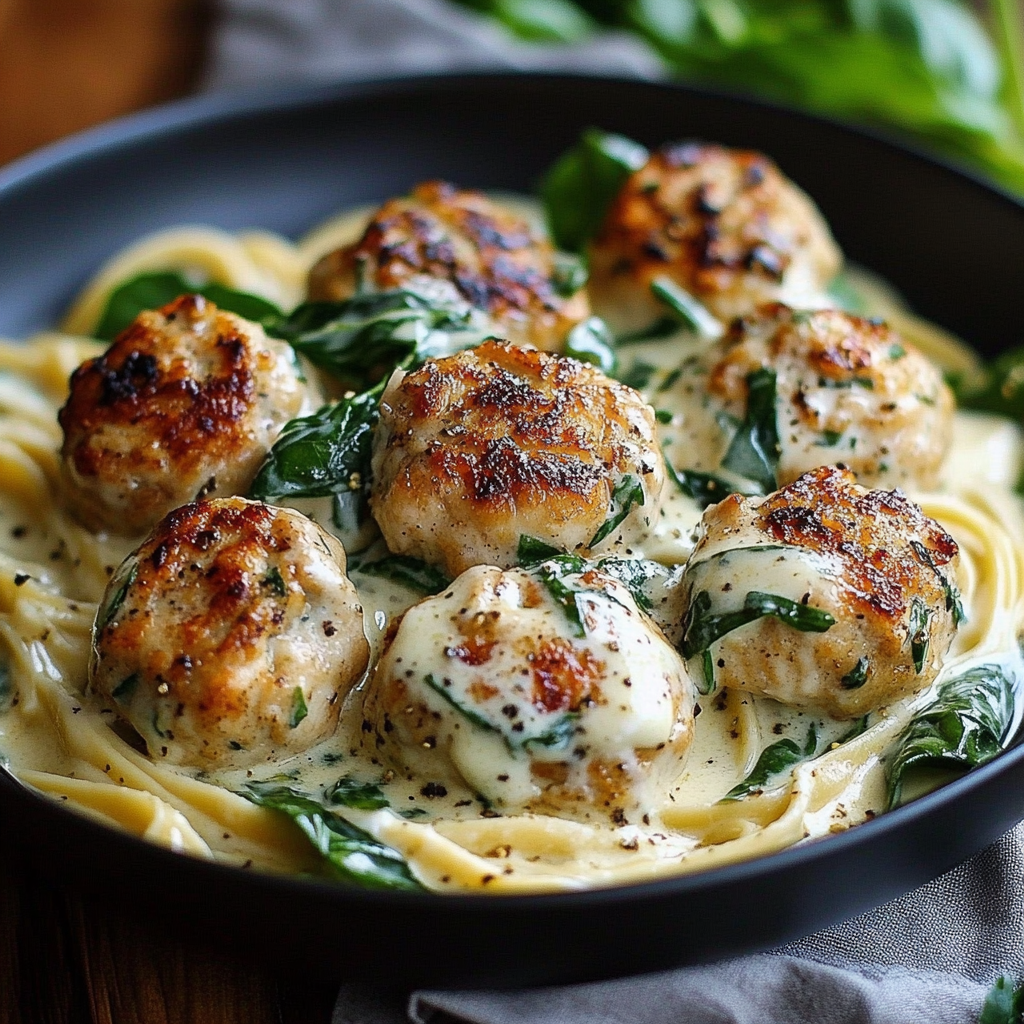 Boulettes de Poulet à la Ricotta avec Sauce Alfredo aux Épinards