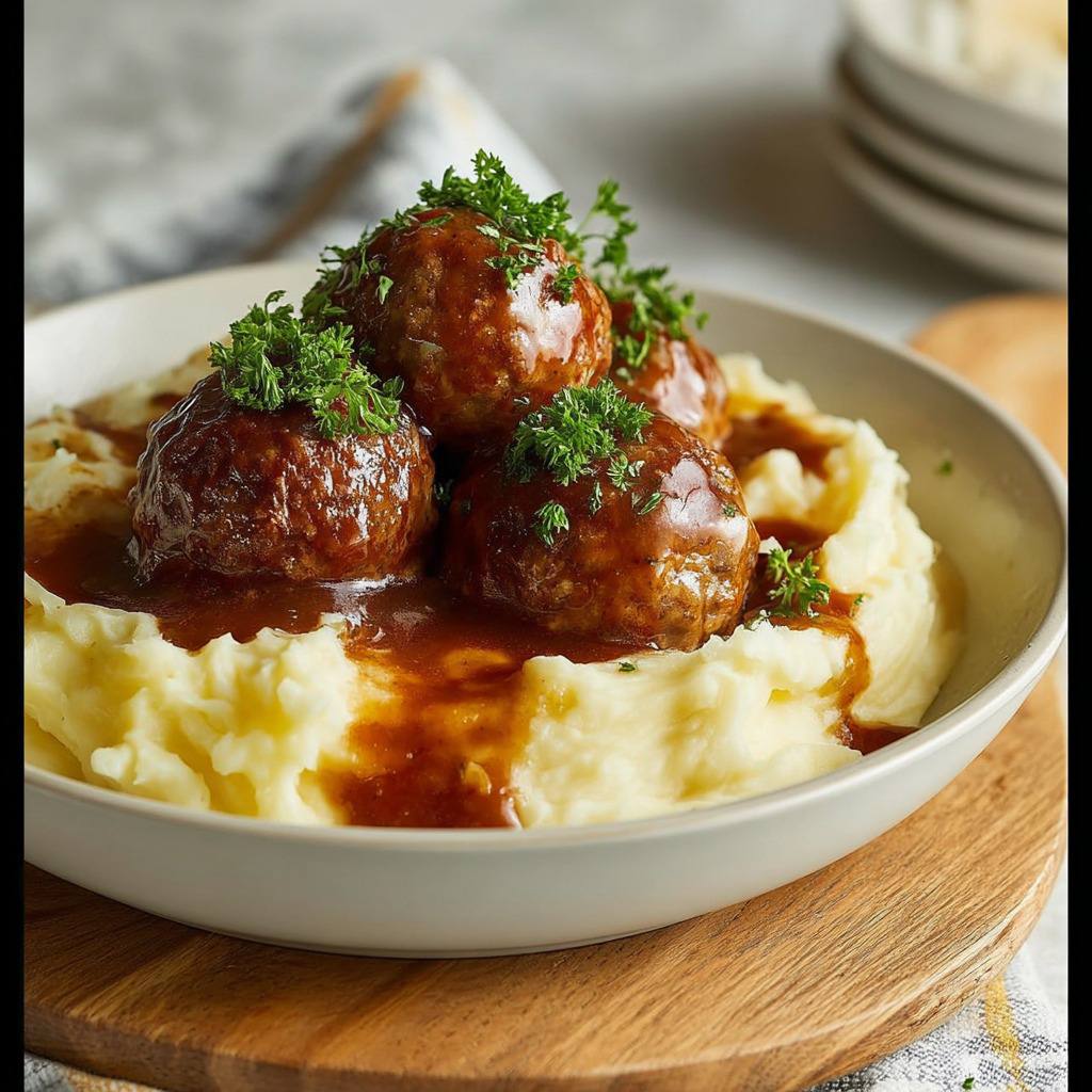 Les boulettes de viande avec purée de pommes de terre à la manière Salisbury constituent un plat classique, réconfortant et copieux, apprécié pour son goût riche et sa texture fondante. Ce repas combine des boulettes de viande savoureuses, préparées avec soin, avec une purée de pommes de terre onctueuse et veloutée, le tout nappé d’une sauce savoureuse qui rappelle la tradition américaine du « Salisbury steak ». C’est un plat idéal pour un dîner familial, un repas entre amis ou même pour une occasion spéciale où le confort et la saveur sont à l’honneur.