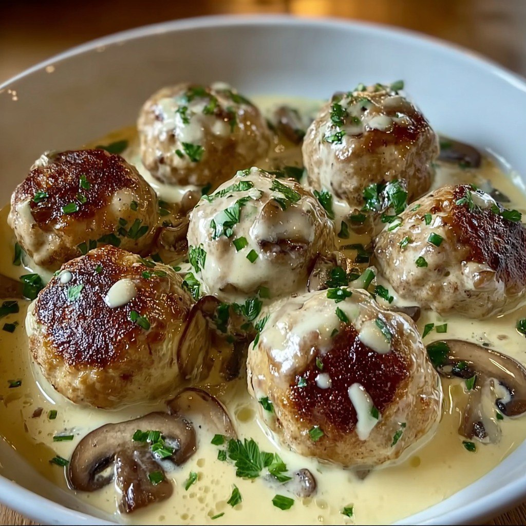 3. Servez immédiatement, en nappant généreusement les boulettes avec la sauce aux champignons.