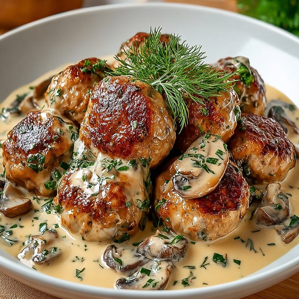 Replacez les boulettes dans la sauce et laissez mijoter à feu doux pendant 10 à 15 minutes. Cette cuisson lente permet aux boulettes de s’imprégner de la sauce, tandis que la crème et la moutarde ajoutent richesse et onctuosité. Les champignons à l’intérieur libèrent leur parfum boisé et se mélangent aux arômes de la sauce pour créer un goût profond et harmonieux.