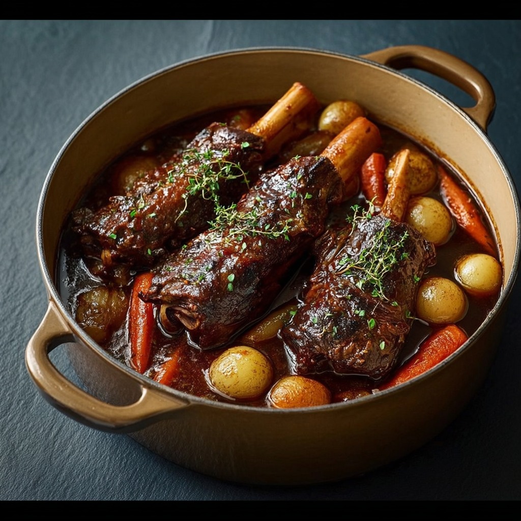 En fin de cuisson, le sel et le poivre sont ajustés avec soin pour équilibrer les saveurs et sublimer la richesse naturelle de l’agneau et du vin. La sauce doit être onctueuse, parfumée et légèrement nappante, capable de recouvrir la viande et les légumes sans être trop liquide ni trop épaisse. Les herbes aromatiques sont retirées, et le plat peut être décoré avec quelques brins de persil frais pour apporter une touche de couleur et de fraîcheur.