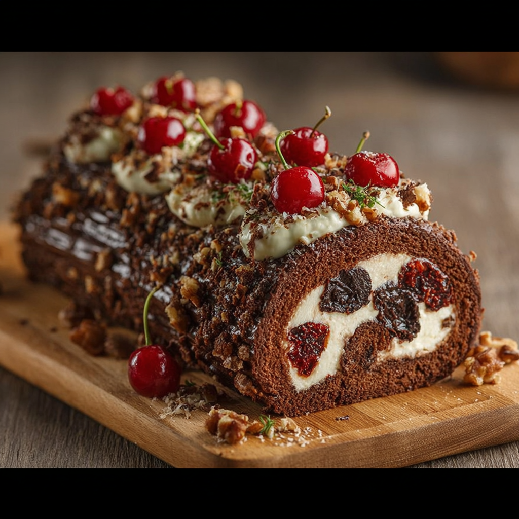 La bûche Forêt Noire est un grand classique des desserts de fête, inspirée du célèbre gâteau allemand Forêt-Noire. Avec son association irrésistible de chocolat, de crème fouettée et de griottes, elle offre un équilibre parfait entre douceur, fraîcheur et intensité.