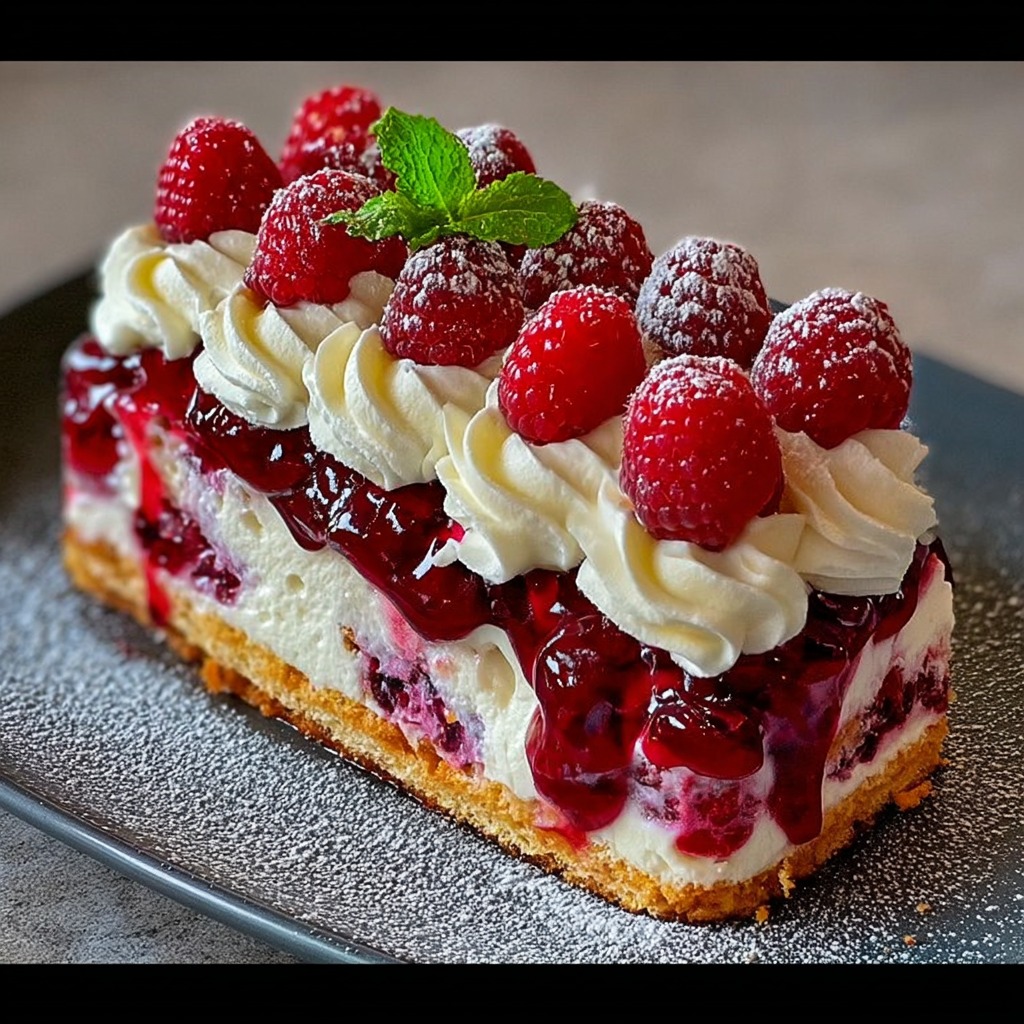 La présentation joue également un rôle essentiel dans la réussite de cette bûche entremets. Servie sur un plat long et décorée de quelques framboises fraîches, elle offre un visuel épuré et élégant. Une fine pluie de poudre de biscuits ou de zestes de citron vient apporter une touche finale discrète mais raffinée.