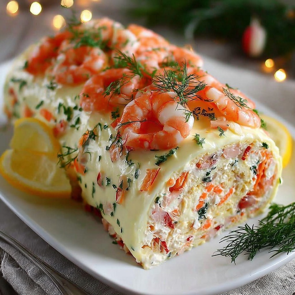 Pour la décoration, des brins d’aneth, quelques crevettes entières et des zestes de citron peuvent être disposés sur le dessus. La bûche salée aux saveurs de la mer peut être servie froide, tranchée en portions régulières, accompagnée d’une salade verte légère ou d’un filet de citron pour apporter de la fraîcheur.