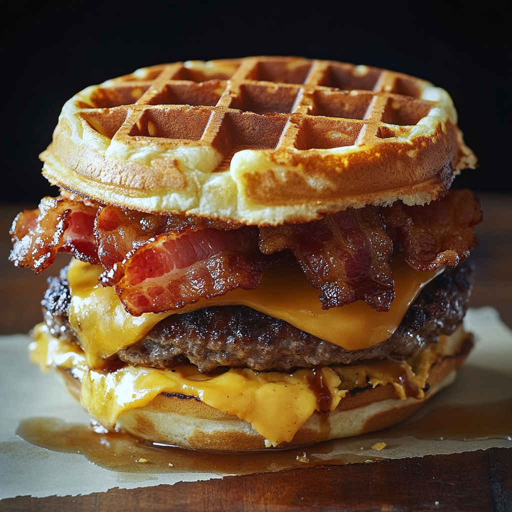 Un burger sucré-salé unique qui combine du bacon croustillant, des gaufres moelleuses et une touche irrésistible de sirop d’érable. Parfait pour un repas gourmand et original !