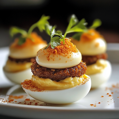 • Prenez les moitiés d’œufs durs et déposez une galette de bœuf chaude sur chaque moitié. Remplissez ensuite chaque moitié d’œuf avec la farce aux œufs mimosa préparée précédemment.